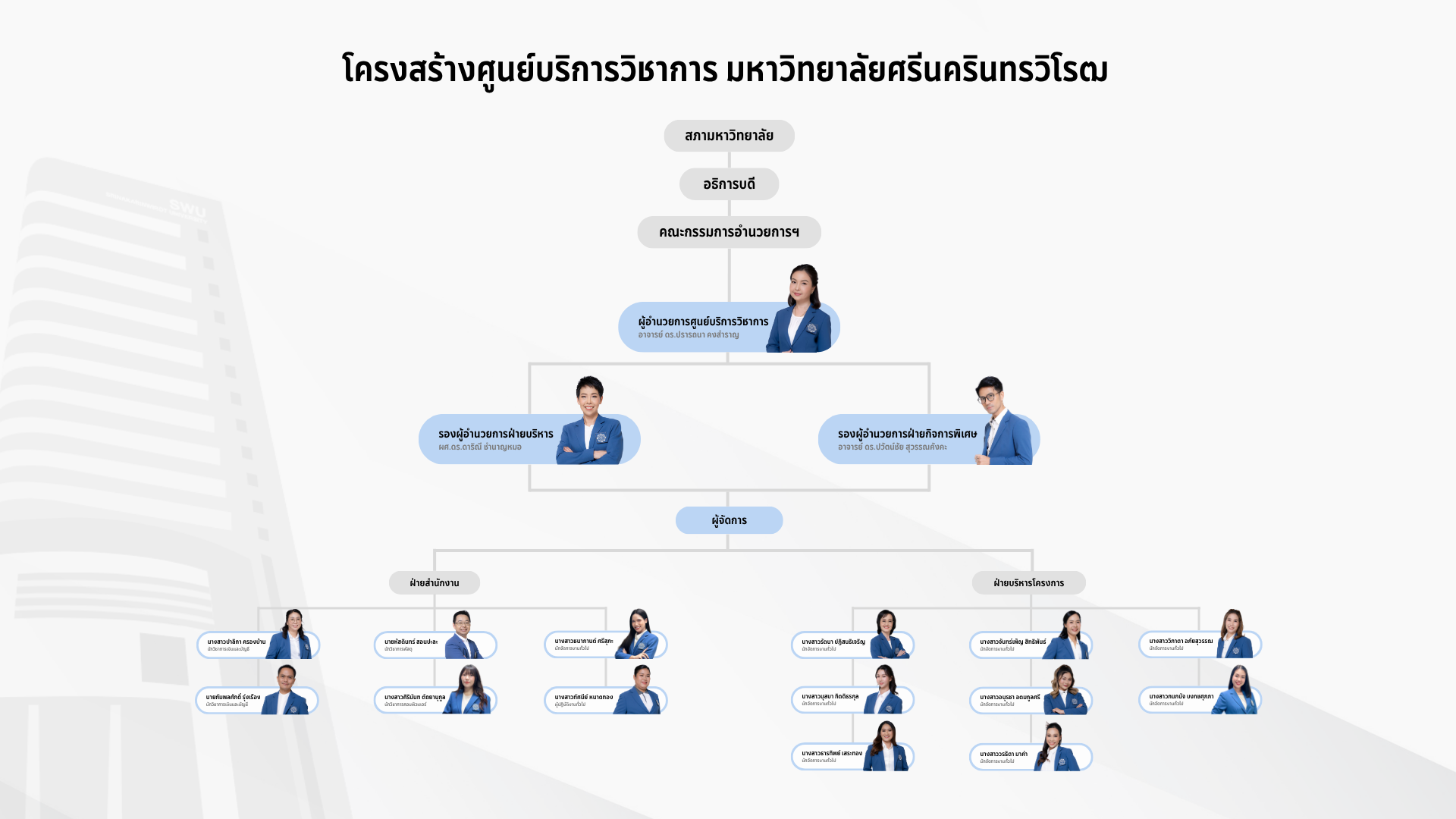 มหาวิทยาลัยศรีนครินทรวิโรฒในฐานะสถาบันการศึกษาระดับอุดมศึกษาของรัฐได้ดำเนินงานตามพันธกิจและหน้าที่ในการผลิตบัณฑิต การวิจัย การบริการวิชาการแก่ชุมชน และการทำนุบำรุงศิลปวัฒนธรรม โดยมีการพัฒนาศักยภาพในด้านต่าง ๆ อย่างต่อเนื่อง ภารกิจที่สำคัญอย่างหนึ่ง คือ การเป็นที่ปรึกษา และให้บริการวิชาการในรูปแบบต่าง ๆ